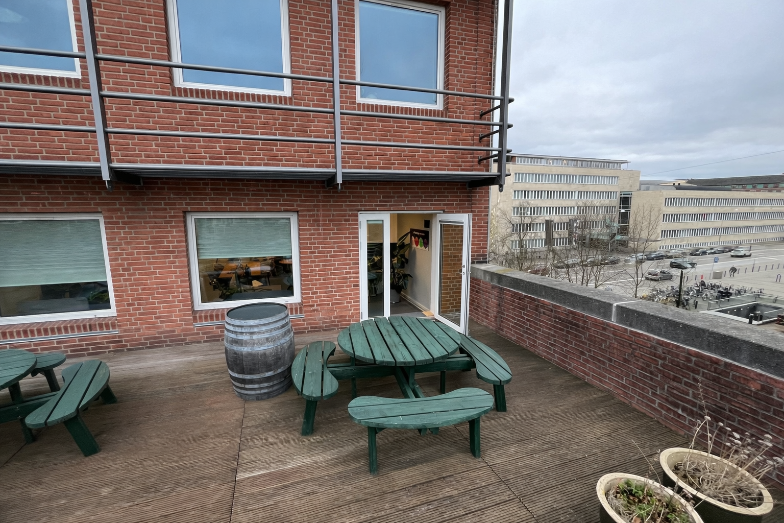 Et af vores særlige træk er vores store tagterrasse, der giver vores lejere mulighed for at nyde den friske luft med en fantastisk udsigt over byen. Det er det perfekte sted at slappe af, netværke med kolleger eller endda arrangere udendørs møder og begivenheder.