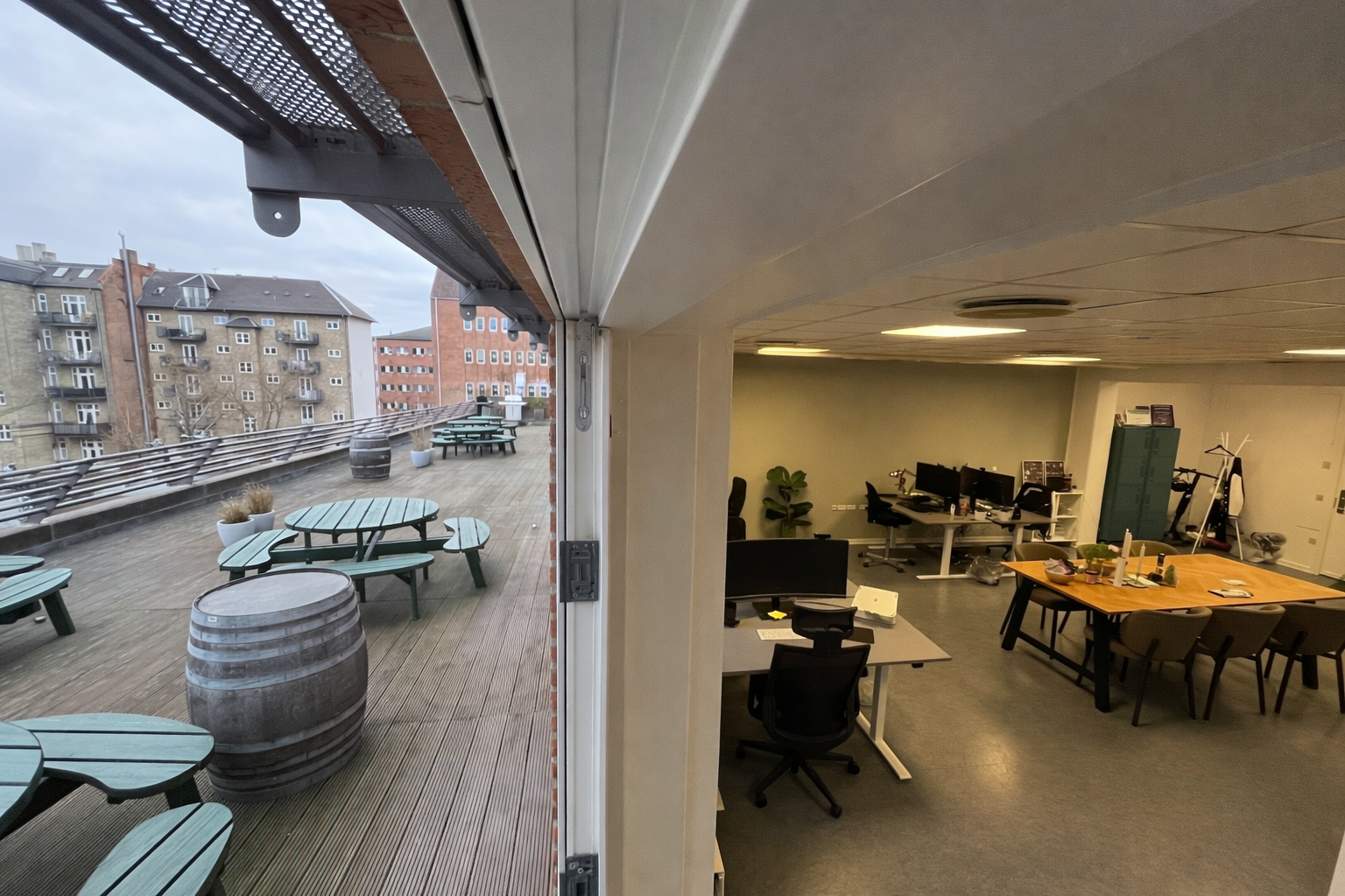 Vi tilbyder et inspirerende arbejdsmiljø med fuldt udstyrede kontorer og fleksible co-working områder. Vores rummelige lokaler giver dig mulighed for at arbejde produktivt og effektivt. Vi har også en stor tagterrasse, hvor du kan slappe af og nyde en fantastisk udsigt over byen.