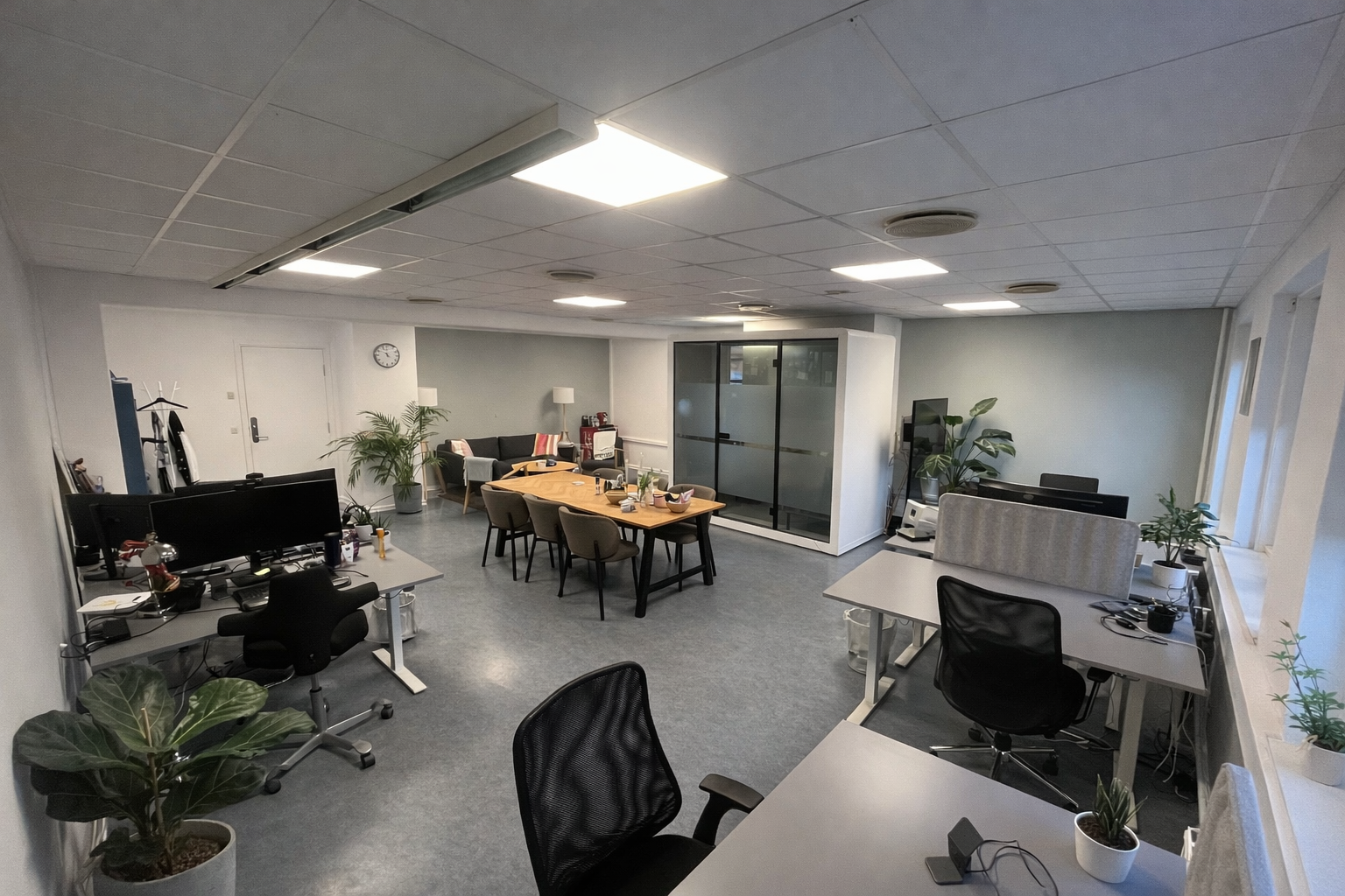 Du kan vælge en flexplads, din egen faste kontorplads i vores coworking eller få dit eget private kontor med 1 til 12+ pladser.